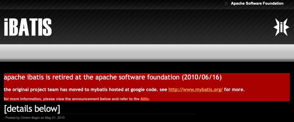 하지만 위의 DTD 링크에 파일이 존재하지 않는다. iBATIS 프로젝트가 Apache Software Foundation 프로젝트에서 2010년 6월 16일에 Retired 되고 Google Code에서 MyBatis(http://www.mybatis.org/) 라는 이름의 프로젝트로 새로운 버전이 릴리즈 되고 있다. 아파치에서 구글로 옮긴 이유는 빠른 변화에 대응하기가 구글이 더 용이하기 때문에 그런거라고 하는데 Migration Steps when Switching from iBATIS toMyBatis 에서 자세한 내용을 확인할 수 있다.