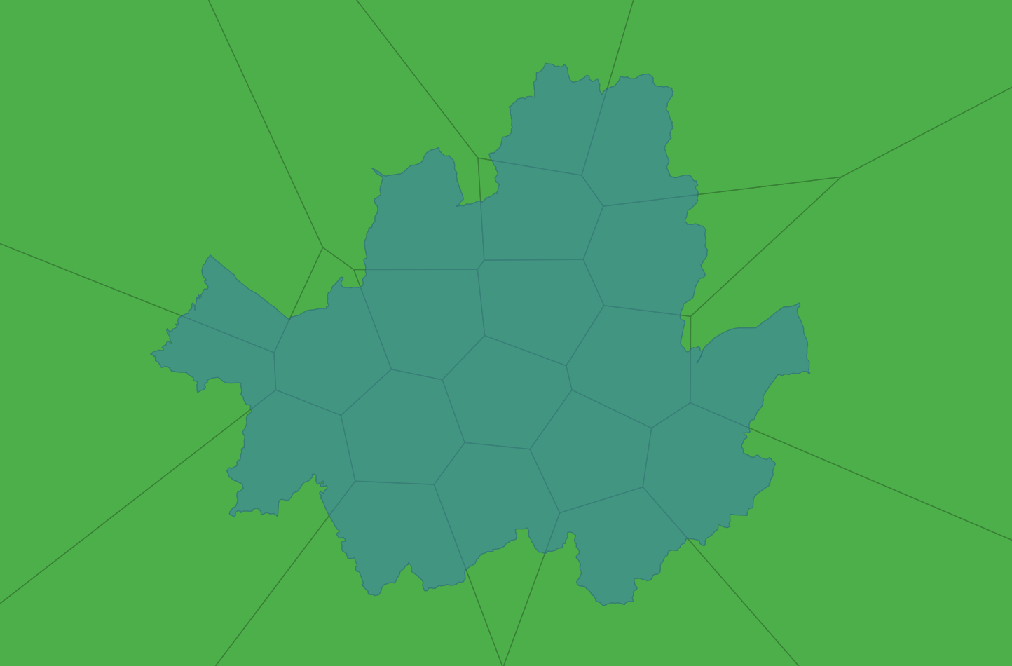 6. Volonoi Polygon과 서울시 경계 Polygon을 교차시켜 경계 영역에 포함하고 있는 볼로노이 분할 영역의 폴리곤을 생성할 수 있습니다.
