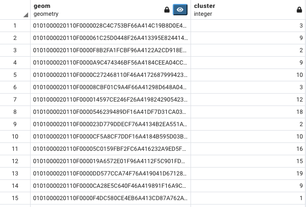 geom, ST_ClusterKMeans(geom, 20) over () AS cluster