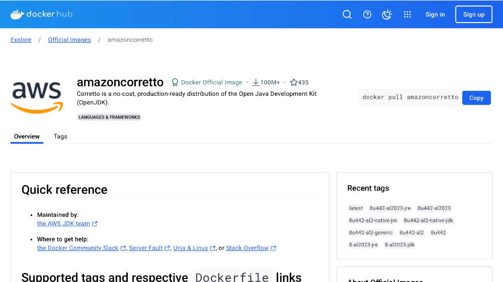 - 도커 허브 공식 이미지 amazoncorretto - Official Image (Link)