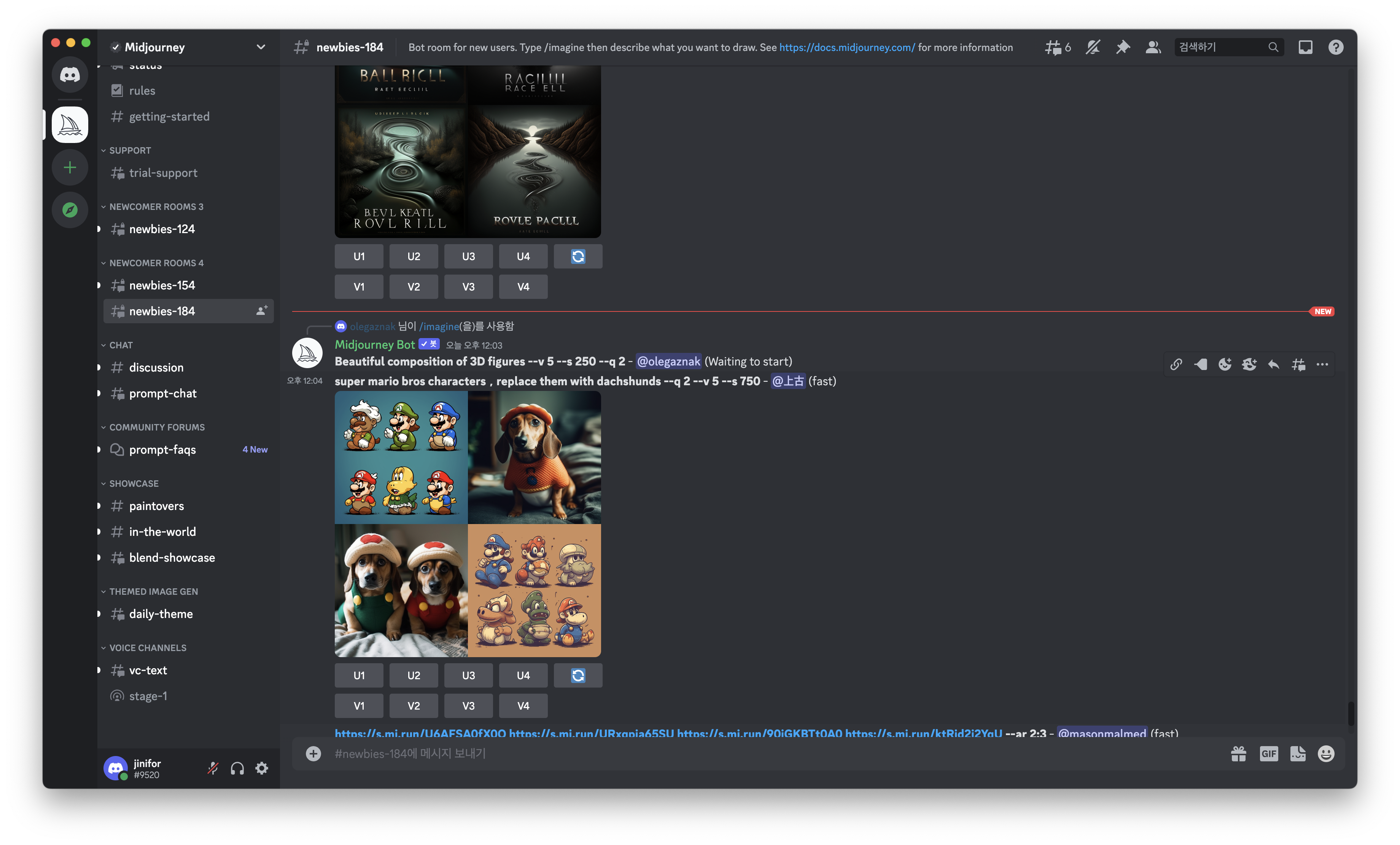 미드저니 봇과 소통하는데 사용하는 문장에 대한 설명을 프롬프트라고 합니다. 시각적 결과를 출력하기 위해 사용해야 하는 설명 문구 및 문장입니다. /imagine 명령으로 시작합니다.