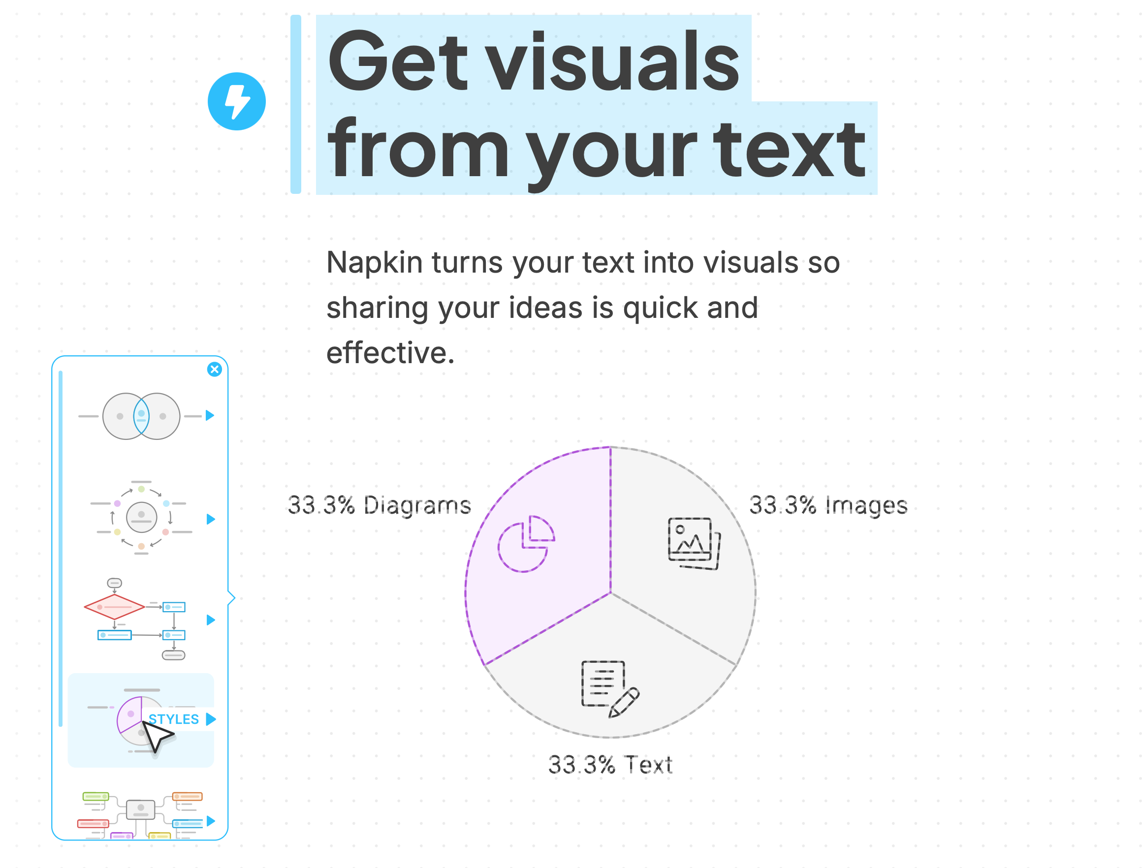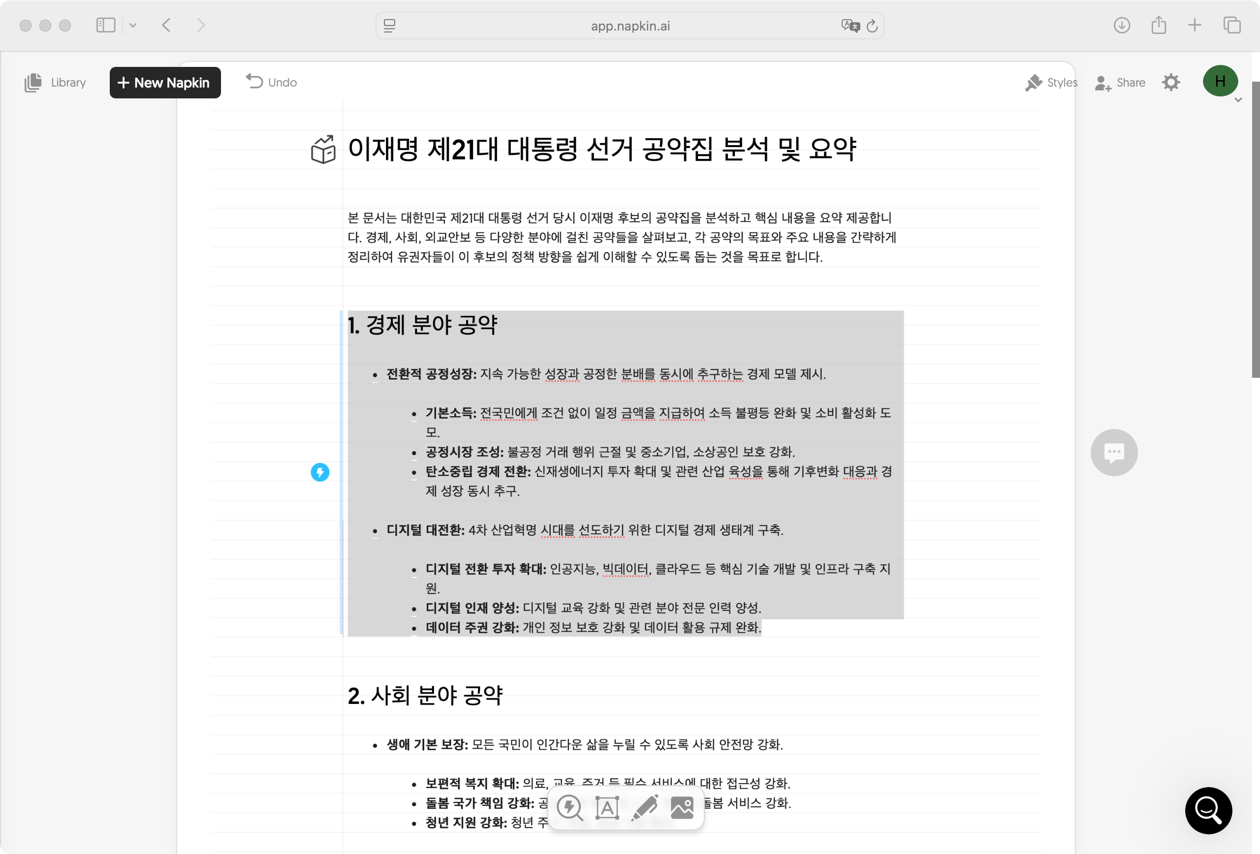 Napkin은 텍스트로 작성된 메모, 문서 등을 즉시 시각적 이미지로 변환하는 AI 도구이다. 아이디어 텍스트를 입력하고 블록을 지정한 후 실행하면 텍스트 내용에 맞게 도식화된 이미지가 수초만에 만들어진다.