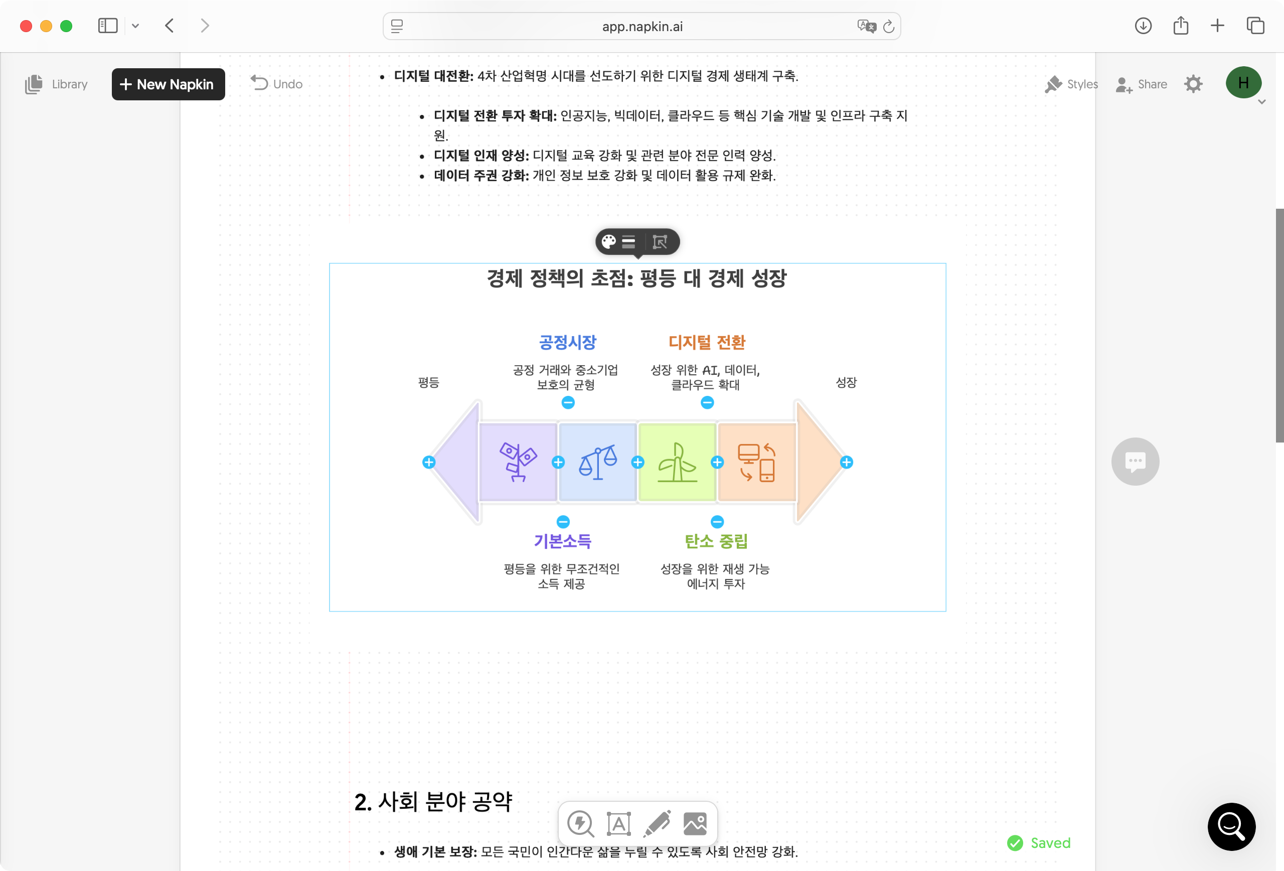 입력된 텍스트 기반 아이디어에 의미 연결은 Napkin AI가 자동으로 분석하여 유사하거나 관련된 개념끼리 연결되어 시각화 된다.