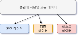 모델을 평가하기 위해서는 데이터가 필요한데, 수집된 데이터를 다음과 같이 훈련, 검증, 테스트 용도로 나눠야 한다. 훈련 데이터는 말 그대로 모델을 훈련시킬 때 사용하고 검증과 테스트는 모델의 성능을 평가하기 위한 용도로 사용한다.