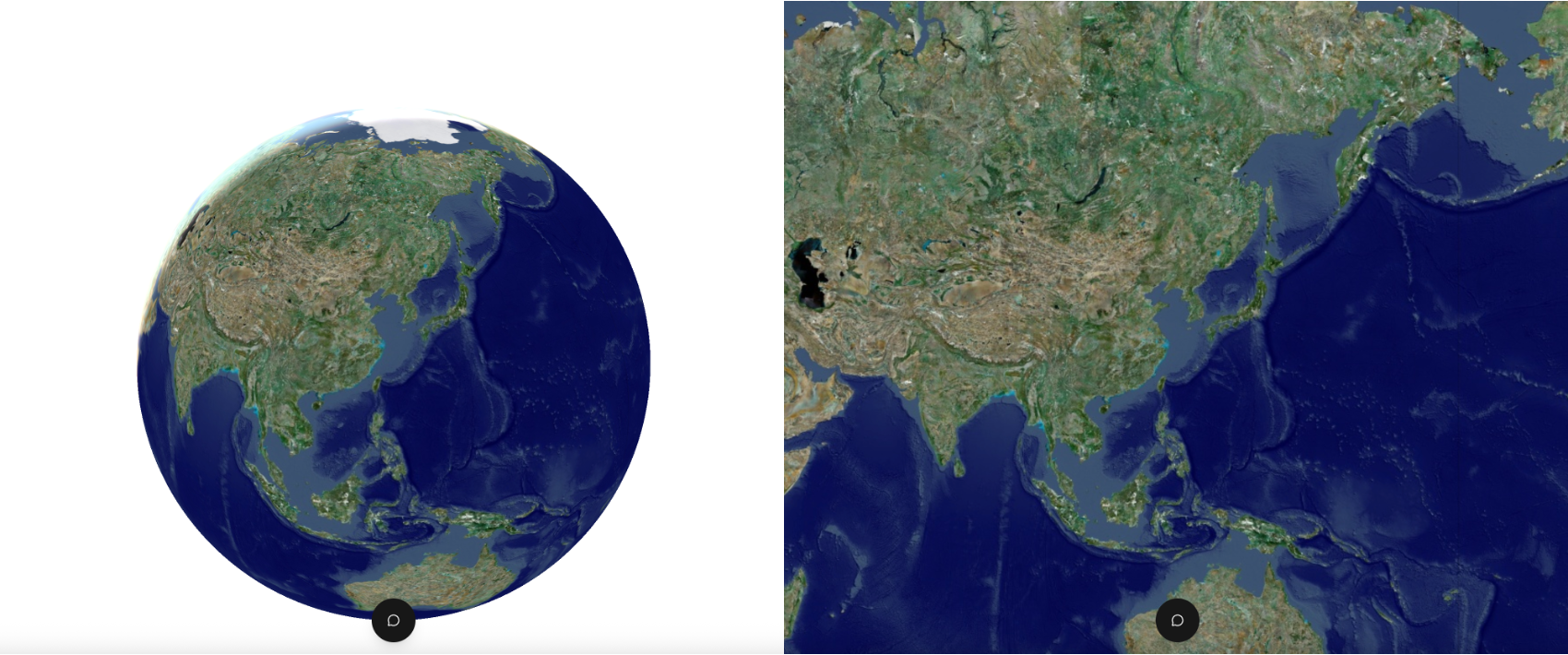 투영법은 지구의 곡면을 2차원 평면으로 표현하는 방식이다. MapLibre GL JS에는 map.setProjection() API, Style Spec을 통해서 mercator, globe 2가지 종류의 투영법을 지정할 수 있다. 다음과 같은 API를 통해 mercator ↔ globe 전환을 쉽게 할 수 있다.