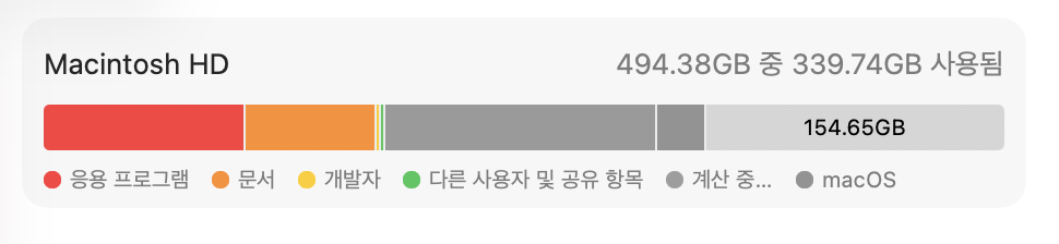 디스크 용량이 부족하다는 메시지를 자주 받았다. 그때마다 외장하드로 프로젝트 파일을 백업했다. 프로젝트 파일, 문서, 코드 등 직접 생산하는 파일은 문서 아주 일부이다. 그런데 이제 보니 문서를 백업하는 것과 응용 프로그램을 지우는 것으로는 부족하다는 것을 눈으로 확인했다. 바로 SSD 500GB 디스크 용량의 반을 차지하고 있는 것이 '시스템 데이터'다.